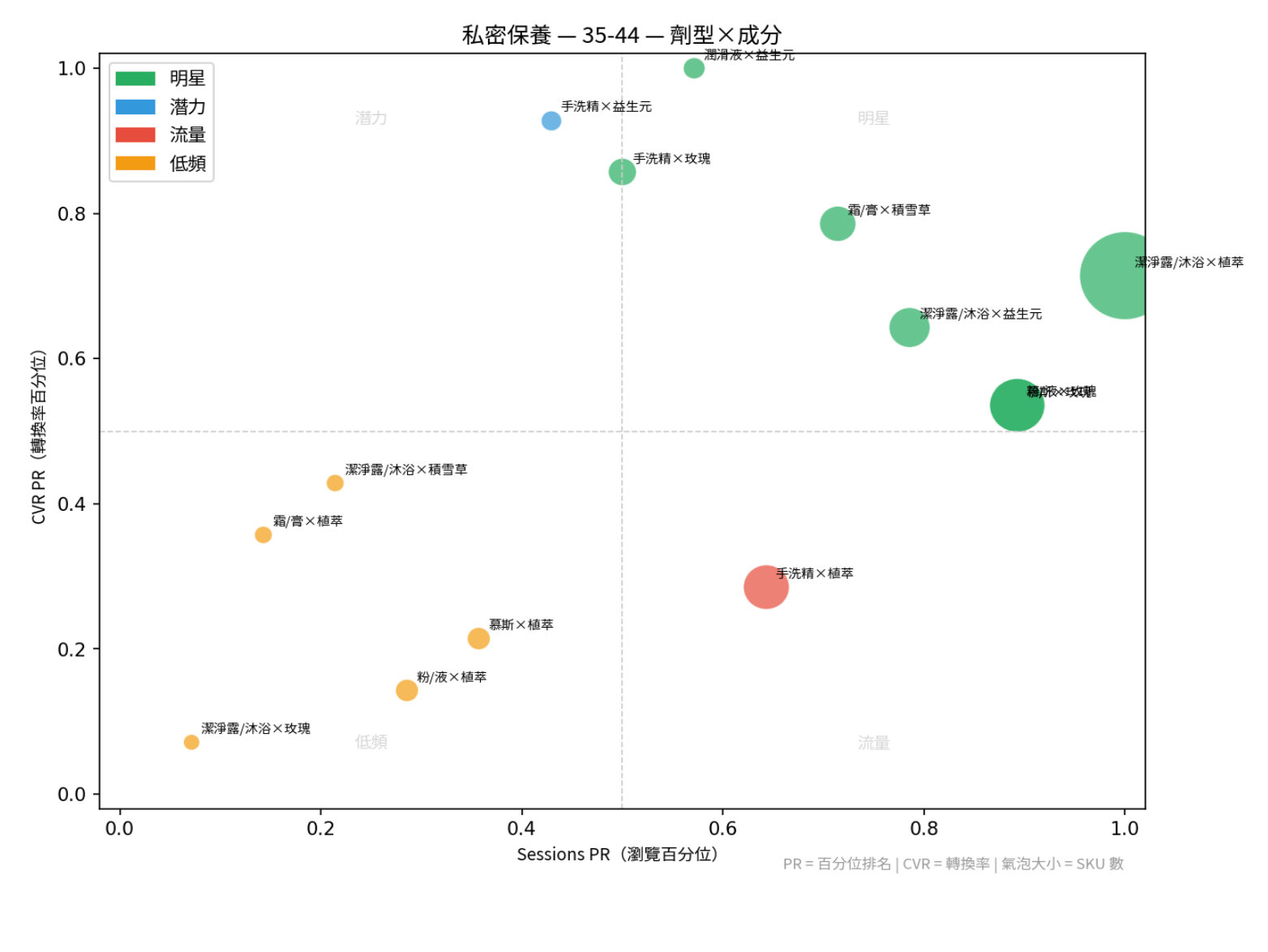 商品標籤四象限分析是 CDMP 獨有的選品方法論,用「瀏覽量 × 轉換率」兩個軸線,將商品屬性標籤(功效、成分、劑型等)在每個客群中分為明星、潛力、流量、低頻四個象限。和一般商品報表最大的差異在於,它的分析單位是「商品屬性 × 客群」而非單一 SKU,能揭示同一個屬性在不同年齡層的表現差異,幫助品牌做出分群化的選品決策。